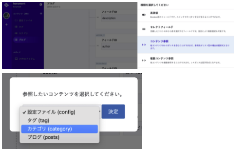 - カテゴリフィールドの種類を「コンテンツ参照」にして、参照先をcategoryに設定